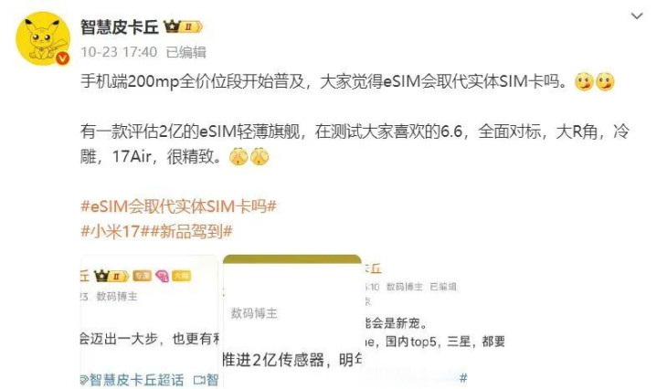 同时,据博主@智慧皮卡丘 爆料称,小米正在评估一款2亿像素镜头、搭载eSIM技术的轻薄旗舰项目,预计命名为小米17 Air。