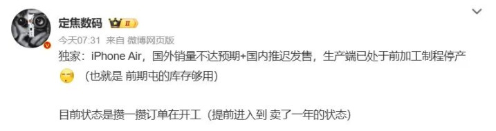 博主@定焦数码 爆料称,由于iPhone Air国外销量不达预期+国内推迟发售,生产端已处于前加工制程停产(也就是前期屯的库存够用)。