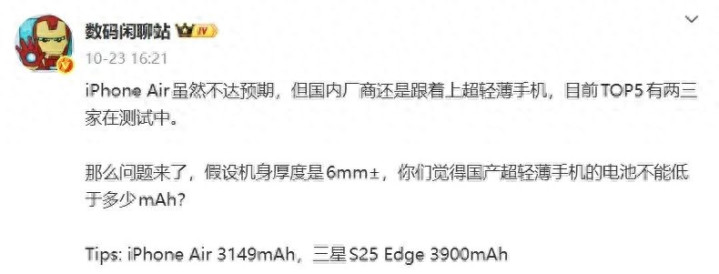 近日,博主@数码闲聊站 爆料称,iPhone Air虽然不达预期,但国内厂商还是跟着上超轻薄手机,目前国内TOP5有两三家在测试中。